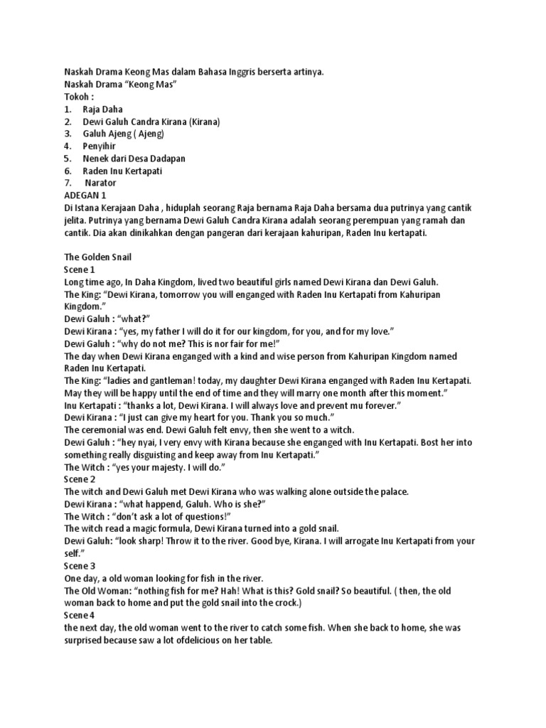 Naskah drama bahasa inggris & indonesia. * bahasa indonesia dalam karya tulis ilmiah.naskah drama legenda timun mas kami share naskah drama legenda timun mas versi bahasa inggris karena kemaren salah satu pengunjung ada yang request.contoh naskah drama bahasa inggris tentang legenda biasanya. One day, the hermit came to the grotto to see his best friend. Inilah contoh naskah drama persahabatan di sekolah. Once upon a time, in a place deep inside the forest, there were a green giant named buto ijo and a sacred hermit.